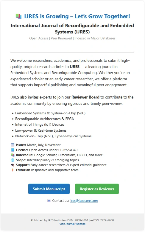 We invite researchers and professionals to explore the most recent calls for papers in the International Journal of Reconfigurable and Embedded Systems (IJRES). Submit your manuscript via online Submissions or join us by being a reviewer here: International Journal of Reconfigurable and Embedded Systems (IJRES) – IAES Reviewer.