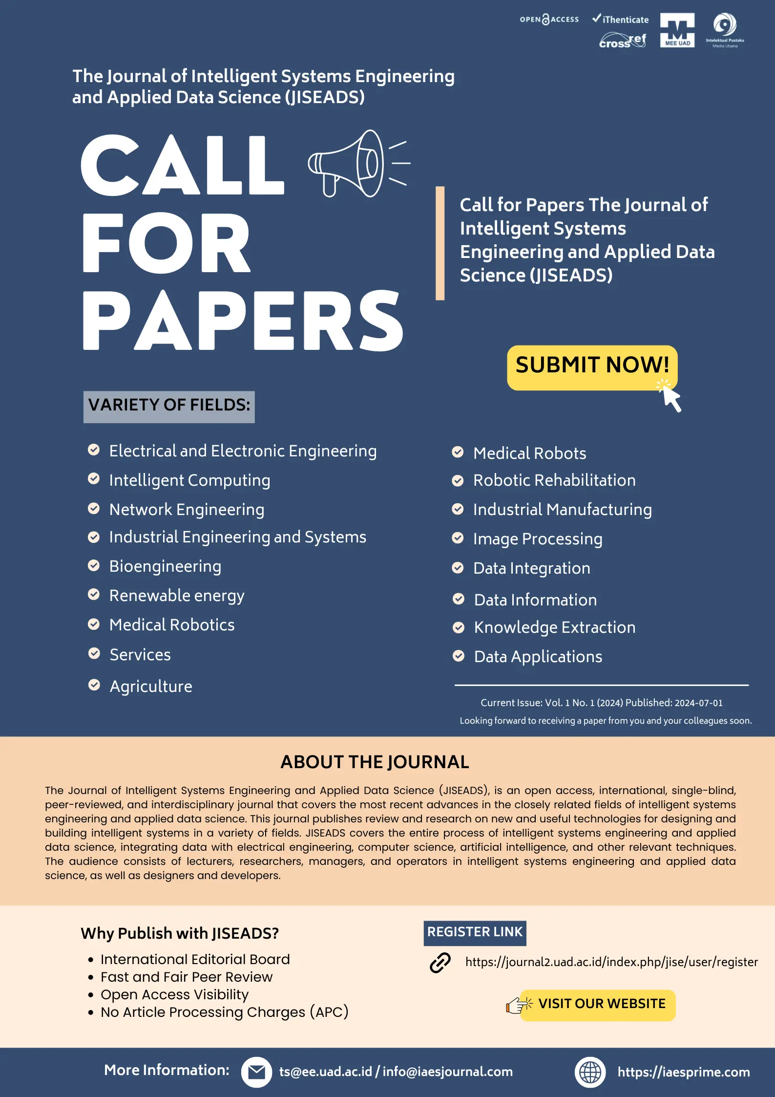 We invite researchers and professionals to explore the most recent calls for papers in the Journal of Intelligent Systems Engineering and Applied Data Science (JISE). Submit your manuscript via online Submissions | Journal on Intelligent Systems Engineering and Applied Data Science.